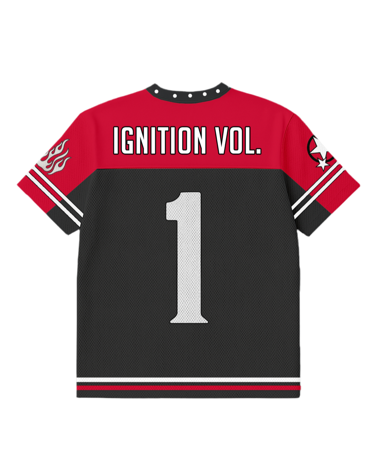This premium piece kicks off our debut collection — Ignition Vol. 1. Designed with bold red & black contrasts, heavyweight quality mesh, and signature flame graphics, this jersey isn’t just streetwear — it’s a statement.